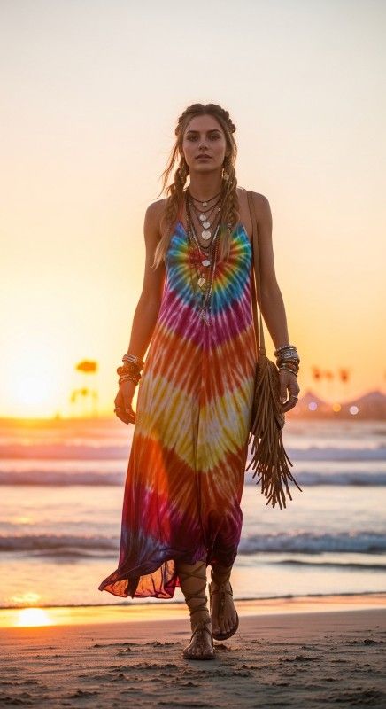 A sunset tie-dye maxi dress in coral and purple creates bohemian flair for beach parties and festivals. The flowing silhouette moves beautifully while the vibrant colors celebrate summer’s energy. Style with gladiator sandals and layered necklaces for complete boho vibes. Add a fringe bag and stacked bracelets for authentic festival styling. Keep hair in loose braids for that effortless beachy look. This free-spirited piece captures summer’s joyful essence.