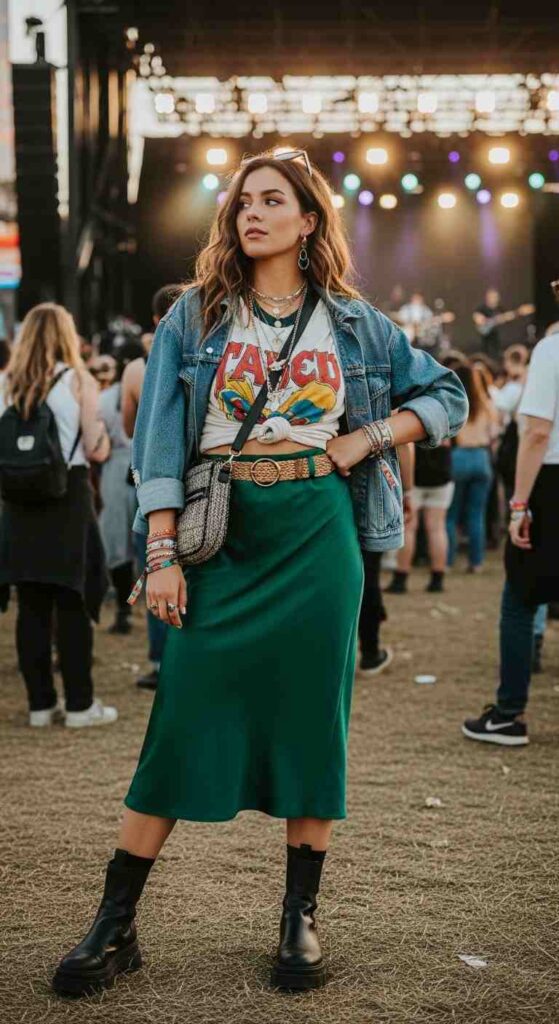 Satin slip skirt in champagne paired with vintage band graphic tee creates trendy juxtaposition. The luxe skirt grounds the casual tee while the tee makes the skirt wearable for daytime. Chunky sandals and shoulder bag complete this Gen-Z approved combination.