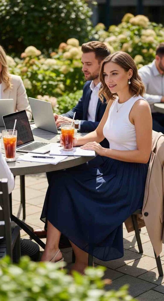 A-line midi skirt in navy linen paired with simple white ribbed tank creates classic simplicity. The tank tuck creates clean lines while the midi length feels modern and appropriate. Nude block heels and structured bag lean slightly more polished.