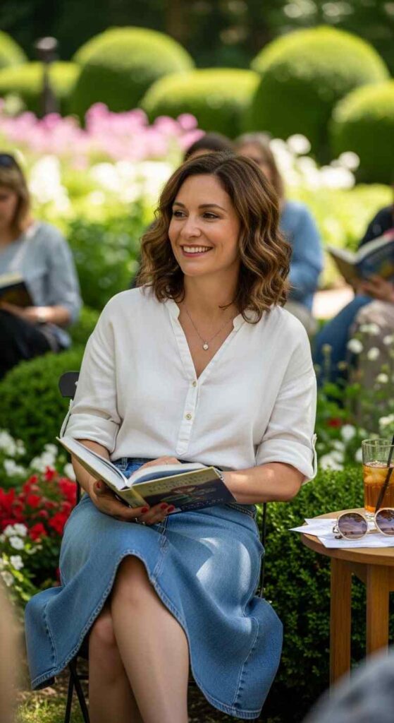 A-line denim midi skirt paired with tucked white linen blouse creates crisp contrast. The denim provides structure while linen keeps it breathable. Brown leather accessories ground the blue-and-white combination warmly.