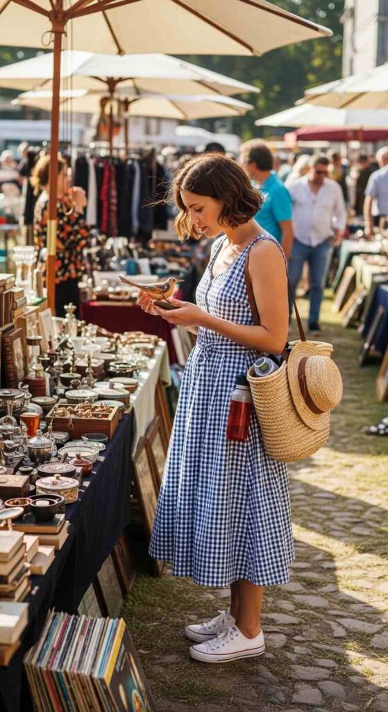 Simple cotton sundress in gingham print paired unexpectedly with white leather sneakers creates casual-cute contrast. The sneakers make the feminine dress practical for walking and exploring. Denim jacket tied around waist adds versatility.