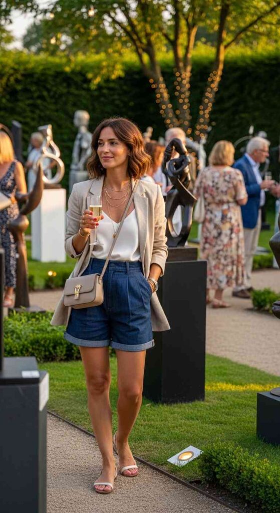 Oversized linen blazer in sand beige paired with high-waisted vintage denim shorts creates sophisticated casual contrast. The structured blazer elevates the casual shorts while both pieces remain breathable. White tank underneath and leather slides complete this high-low mixing mastery.
