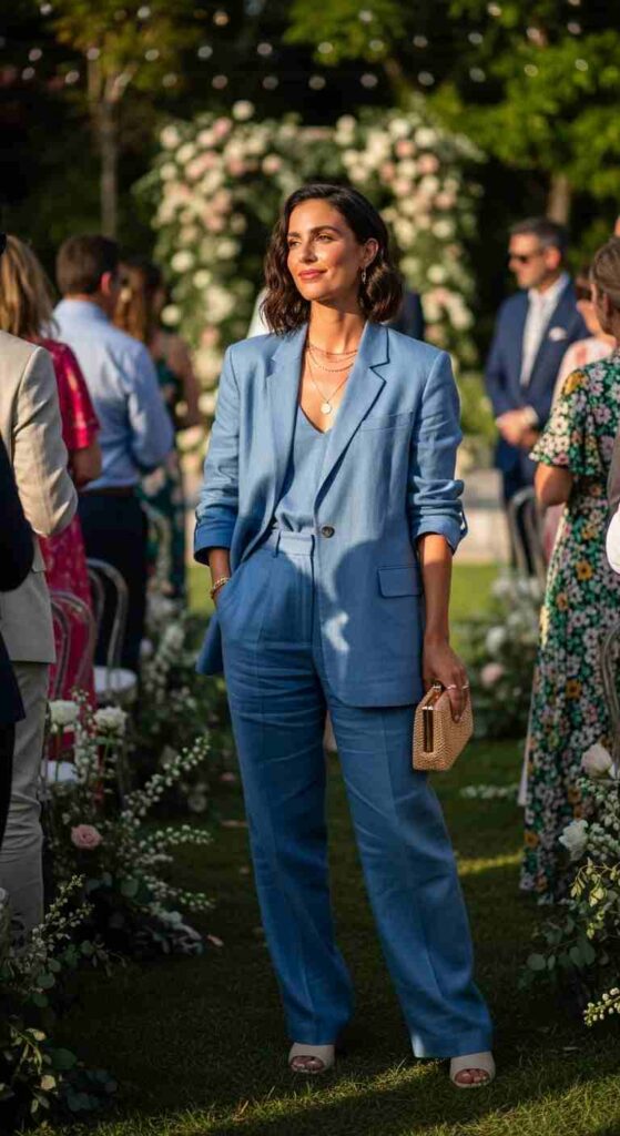 Matching linen blazer and shorts in powder blue creates sophisticated summer suiting. The pastel tone feels seasonally appropriate while the suit structure maintains professionalism. Worn with simple white tank and nude heels for polished finish.