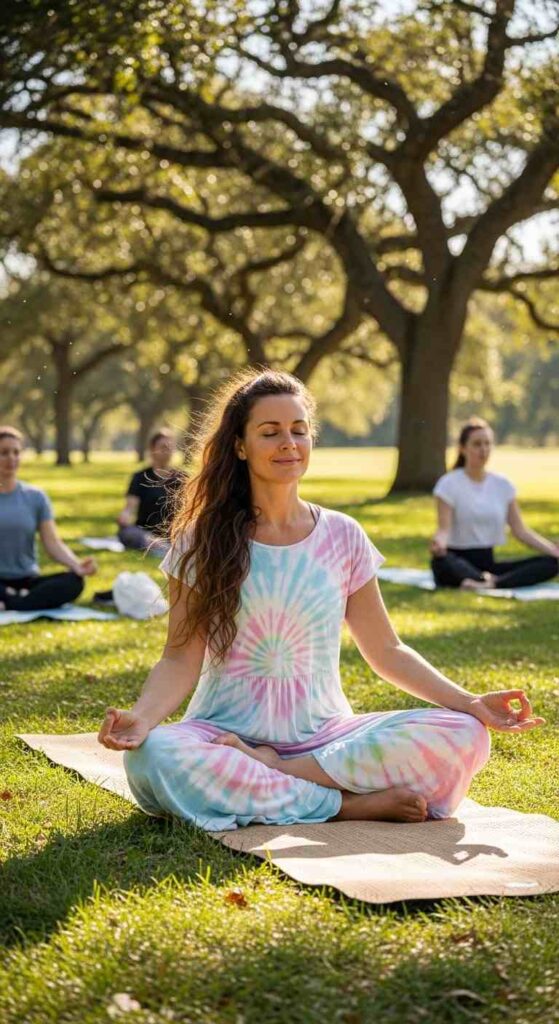 Maxi dress in pastel tie-dye creates bohemian summer ease. The flowing length and soft colors feel romantic and relaxed. Flat sandals and layered necklaces lean into the boho aesthetic while keeping it wearable.