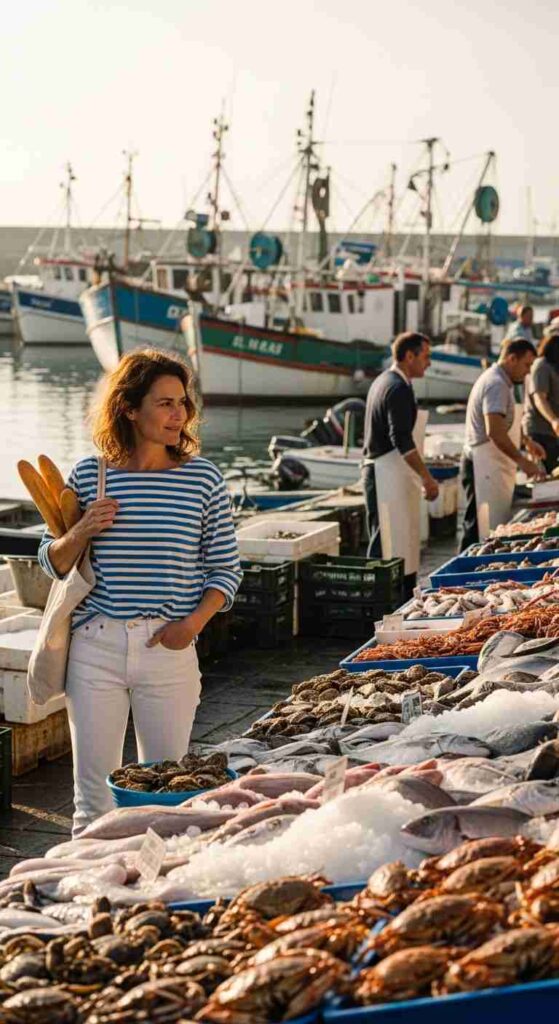 Classic navy and white striped shirt half-tucked into straight-leg white jeans creates nautical sophistication. The timeless combination feels fresh season after season. Canvas espadrilles and straw tote lean into the coastal aesthetic perfectly.