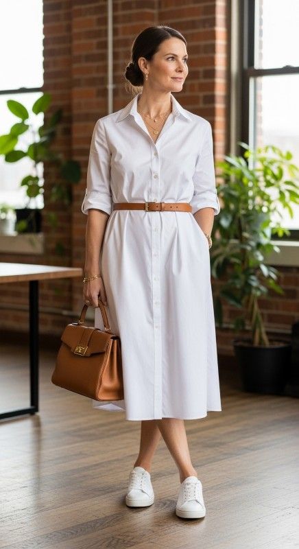 Why It’s Chic: A midi shirt dress is professional and versatile, while white sneakers add contemporary cool and ensure all-day comfort. This combination is perfect for modern workplaces that value both polish and practicality—effortless sophistication for the active woman over 40.