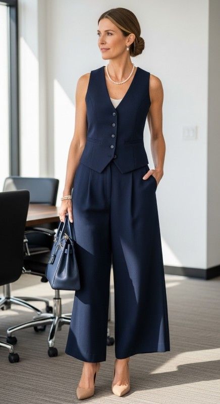 Why It’s Chic: This sophisticated three-piece alternative features a tailored vest that provides polish without the bulk of a full blazer. Paired with wide-leg pants and a simple shell, this combination is breathable, professional, and perfectly modern for women over 40.