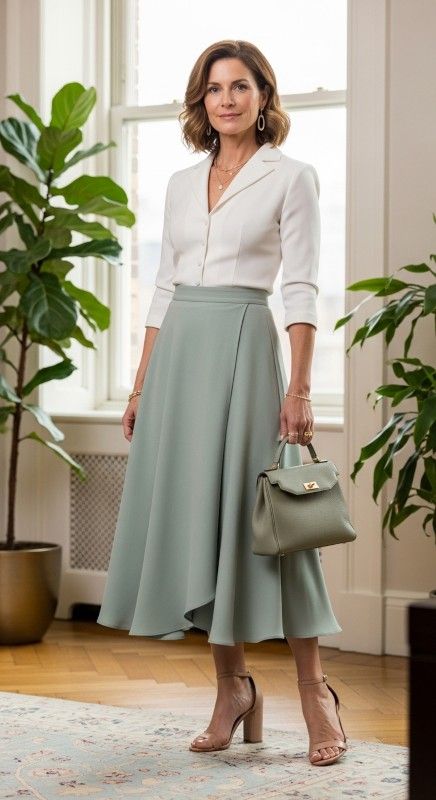 Why It’s Chic: A midi wrap skirt creates beautiful movement and allows ventilation while maintaining professionalism. Paired with a structured top and block heels, this combination balances flow and structure for a polished, breathable look that’s perfect for women over 40.