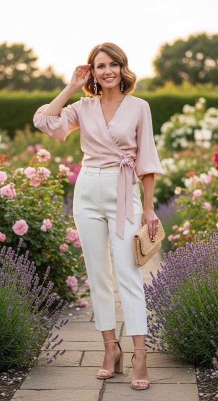 Why It’s Chic: This feminine combination is both comfortable and polished. A wrap blouse is universally flattering, cropped trousers provide structure, and block heels add height and stability. It’s perfect for summer events when you want to look elegant without sacrificing comfort.