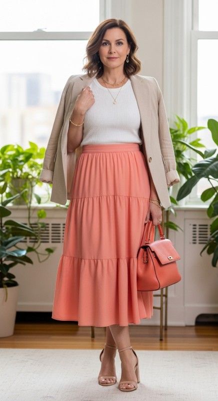 Why It’s Chic: This layered combination features a tiered midi skirt for movement and breathability, paired with a simple tank and blazer for polished layering. It’s professional, breathable, and perfectly adapted for air-conditioned offices or variable summer weather.