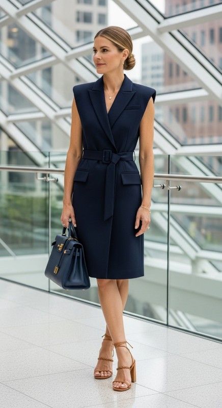 Why It’s Chic: This modern take on the blazer dress features a sleeveless design for maximum breathability while maintaining professional structure. Strappy sandals add polished ease and ensure all-day comfort. It’s sophisticated summer dressing for the confident woman over 40.