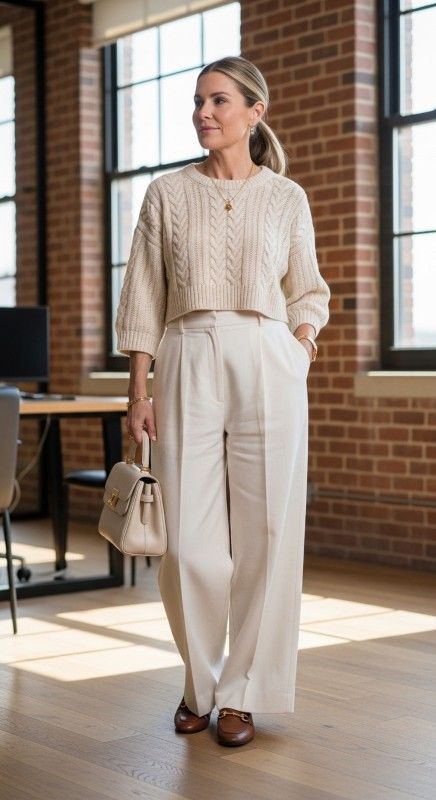 Why It’s Chic: This combination balances proportions beautifully—wide-leg linen pants allow air circulation while a lightweight crop sweater adds cozy texture without bulk. Loafers provide preppy polish while ensuring all-day comfort.