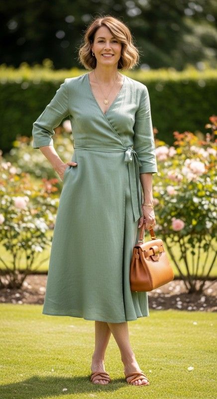 Why It’s Chic: A linen wrap dress is the ultimate summer essential for women over 40—breathable, flattering, and effortlessly elegant. The wrap silhouette cinches at the waist for definition while the flowing skirt provides comfortable movement. Paired with leather slide sandals, this look is polished enough for lunch dates yet relaxed enough for all-day wear.