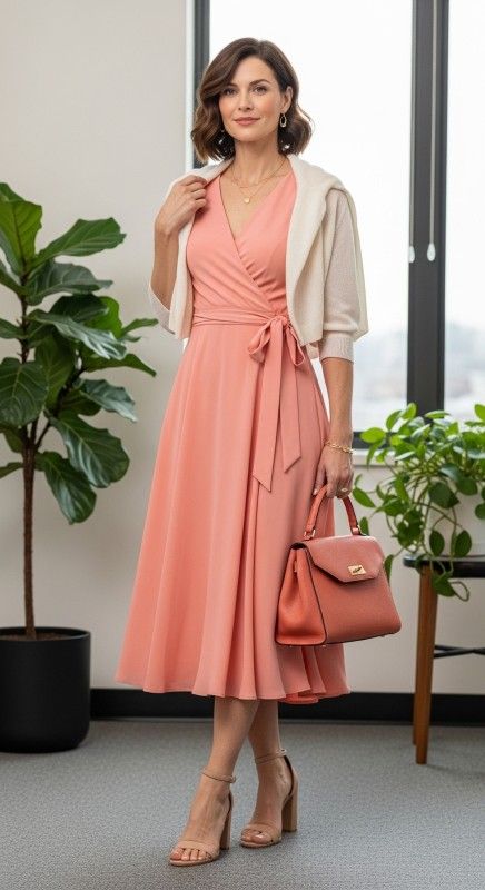 Why It’s Chic: A sleeveless wrap dress is breathable and flattering, while a lightweight cardigan provides coverage for air-conditioned offices. This combination is versatile, professional, and perfectly adapted for summer office life for women over 40.