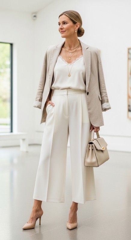 Why It’s Chic: Cropped wide-leg pants allow maximum air circulation while the cropped length keeps the look fresh and modern. Paired with a fitted shell and mules, this combination is breathable, professional, and perfectly proportional for women over 40.