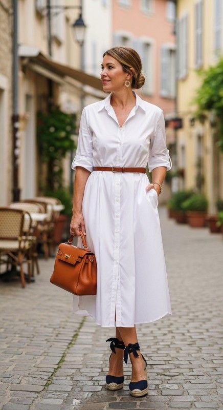 Why It’s Chic: A midi shirt dress is versatile, professional, and incredibly comfortable. The button-front allows ventilation, the midi length is universally flattering, and a leather belt defines the waist for a polished silhouette. Espadrille wedges add height and that perfect European summer touch while ensuring all-day comfort.