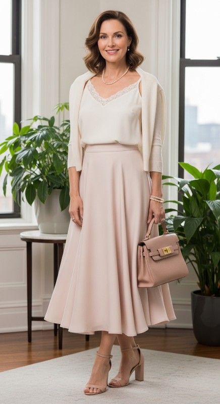 Why It’s Chic: This layered combination features an A-line midi skirt for movement and breathability, paired with a sleeveless shell and lightweight cardigan for versatile coverage. It’s professional, breathable, and perfectly adapted for air-conditioned offices or variable summer weather.