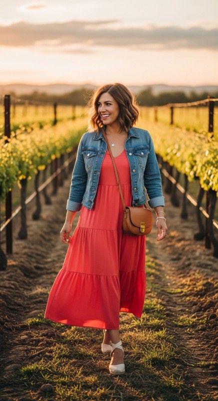 Why It Works: Tiered sundresses are feminine and forgiving, while a denim jacket adds structure and versatility for cooler moments. This layered approach extends the wearability of summer dresses into evening or air-conditioned spaces.