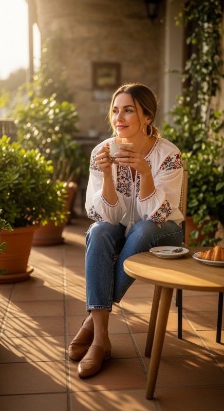 Why It Works: Embroidered details add interest and artistry to simple pieces. Straight-leg jeans are comfortable and timeless, providing a neutral base for a special top. This combination balances casual and dressed-up perfectly.