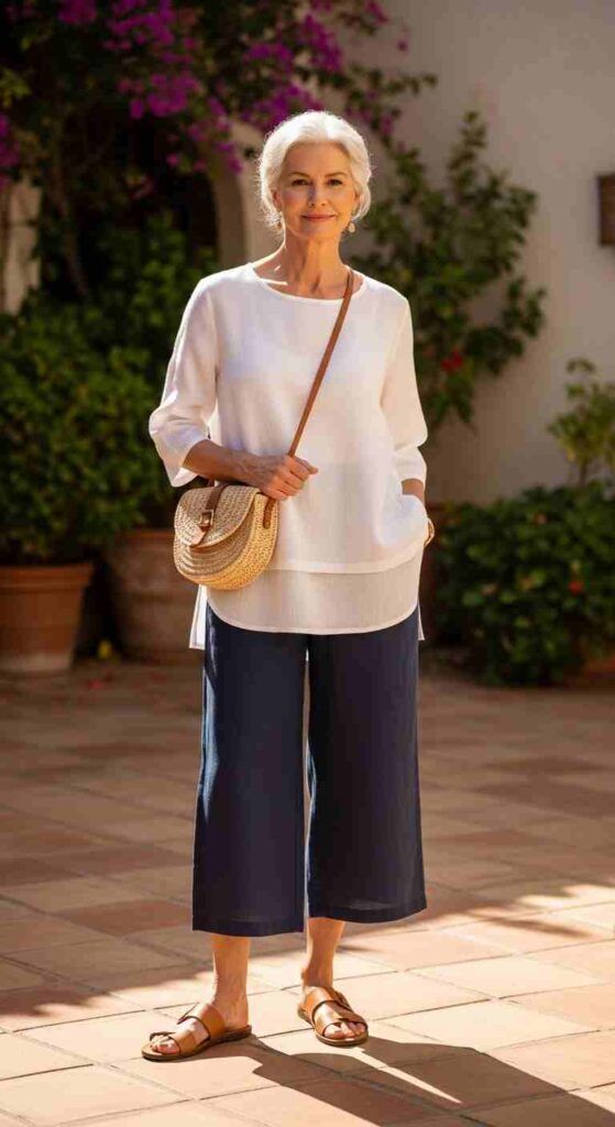 Why It Works: Linen tunics provide coverage while staying cool, and wide-leg cropped pants offer comfort without dragging on the ground. This combination creates a relaxed yet polished silhouette that’s perfect for warm days. The loose fit allows for easy movement and breathability.