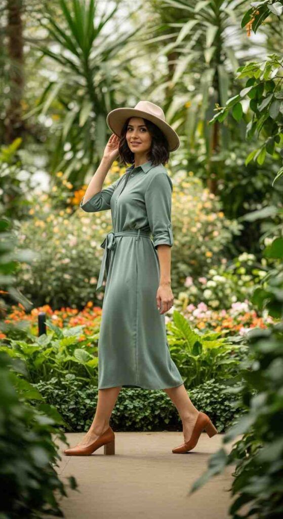 Why It Works: Midi lengths are universally flattering and appropriate for any occasion. Three-quarter sleeves protect arms from sun while keeping you cool. A shirt dress offers structure without stiffness, and the button-front allows ventilation adjustment throughout the day.