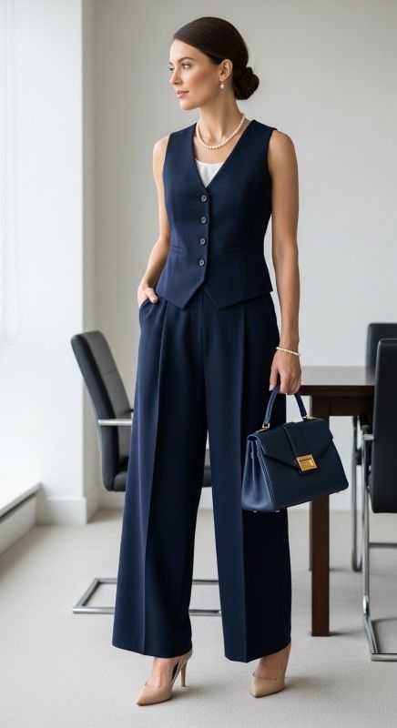 Why It Works: This sophisticated three-piece alternative features a tailored vest that provides polish without the bulk of a full blazer. Paired with wide-leg pants, this combination is breathable, professional, and perfectly modern.