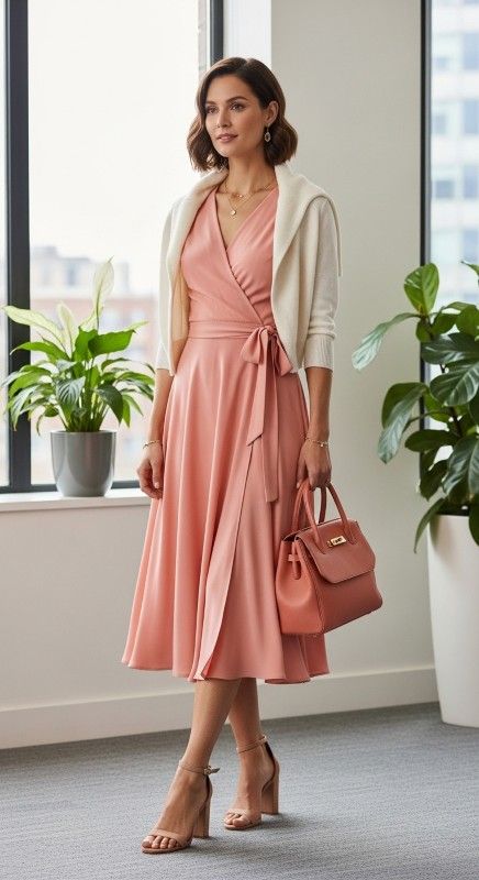 Why It Works: A sleeveless wrap dress is breathable and flattering, while a lightweight cardigan provides coverage for air-conditioned offices. This combination is versatile, professional, and perfectly adapted for summer office life.