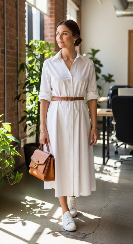 Why It Works: A midi shirt dress is professional and versatile, while white sneakers add contemporary cool and ensure all-day comfort. This combination is perfect for modern workplaces that value both polish and practicality.