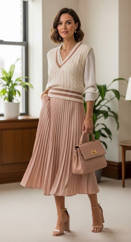 Why It Works: This layered combination features a pleated midi skirt for movement and breathability, paired with a knit vest for polished layering. It’s professional, breathable, and perfectly adapted for air-conditioned offices.
