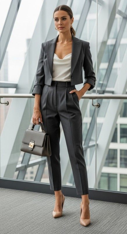 Why It Works: This contemporary combination features high-waisted trousers paired with a cropped blazer, creating a modern, proportional silhouette. The cropped blazer keeps you cool while maintaining polish, and high-waisted trousers elongate the legs.