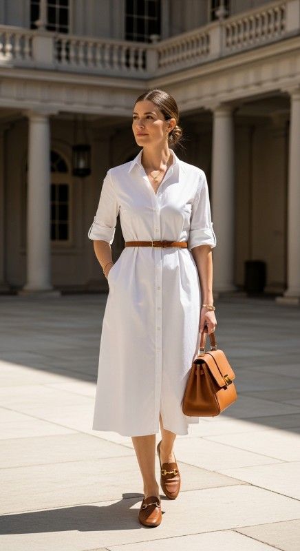 Why It Works: A midi shirt dress is versatile, professional, and incredibly comfortable. The button-front allows ventilation, the midi length is office-appropriate, and a belt defines the waist for a polished silhouette. Loafers add preppy polish while ensuring all-day comfort.