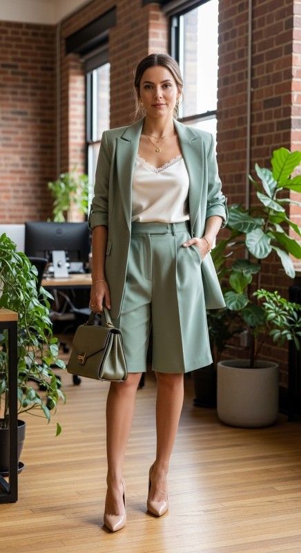 Why It Works: A tailored shorts suit is the ultimate summer power move—professional, polished, and perfectly cool. The matching blazer and shorts create instant polish while the silk camisole adds luxurious texture. This look proves shorts can be office-appropriate when executed with precision.