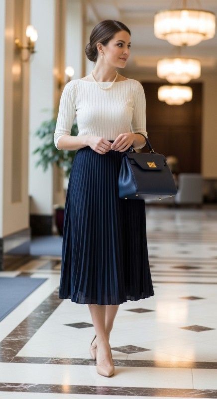 Why It Works: A pleated midi skirt creates beautiful movement and breathability while maintaining professionalism. Paired with a fitted knit top, this combination balances volume and structure. The pleats allow air circulation while the fitted top keeps the silhouette polished.