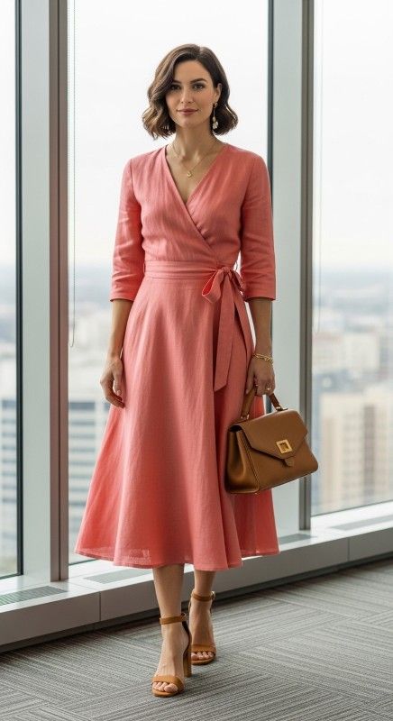 Why It Works: A linen wrap dress is universally flattering, breathable, and effortlessly professional. The wrap silhouette creates a flattering V-neckline and adjustable fit, while linen keeps you cool. Block heels provide stability and polish for all-day wear.
