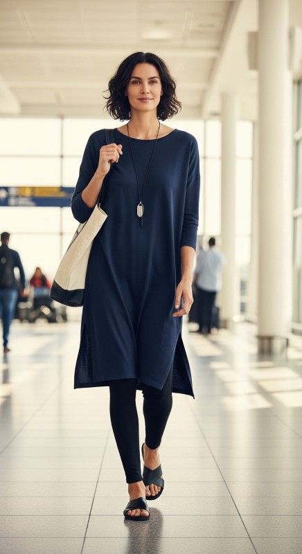 An extra-long tunic in navy with side slits paired with black leggings provides comfortable coverage for tall women on the go. The extended length ensures proper proportions while the breathable fabric keeps you cool. Add flat sandals or sneakers and a long pendant necklace for visual interest. Carry a roomy tote bag for all your summer essentials. This outfit works for travel days, running errands, or casual coffee dates. The simple silhouette allows for easy mixing with other wardrobe pieces.