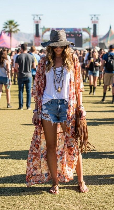 An extended length kimono in floral print layered over a tank and shorts provides bohemian style with proper coverage for tall frames. The extra length creates beautiful vertical lines while the flowing fabric keeps you cool. Pair with flat sandals and a fringe bag for festival-ready style. Add layered necklaces and a floppy hat for complete boho styling. This versatile layer works over multiple outfit combinations. The floral print celebrates summer’s vibrant energy perfectly.