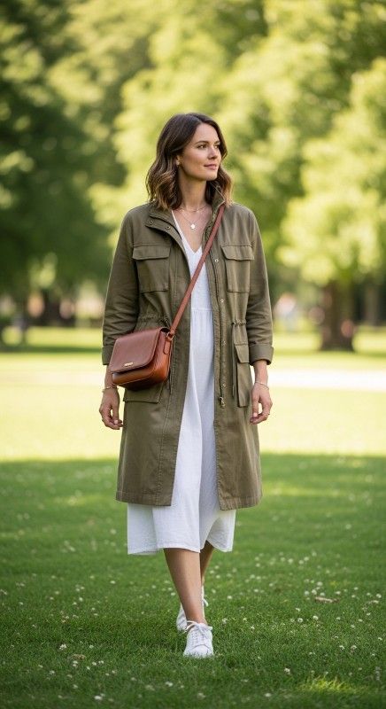 A longline utility jacket in khaki layered over a dress or tank and jeans adds structure to tall frames. The extended length provides coverage while the utility details add visual interest. Pair with sneakers or boots depending on the season and occasion. Add a crossbody bag and keep jewelry minimal for a balanced look. This versatile layer works for transitional weather and casual outings. The neutral color pairs with virtually any outfit in your wardrobe.