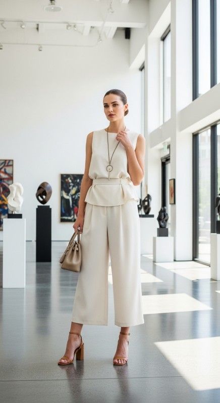 Wide-leg culottes in cream paired with a matching sleeveless top create a modern monochromatic look for tall women. The extended inseam ensures proper length while the wide leg provides comfort and style. Add block heel sandals and a structured bag for polished daytime wear. Layer a long necklace and wear hair sleek for contemporary elegance. This coordinated set simplifies dressing while ensuring proper proportions. The neutral palette works for professional or casual settings.