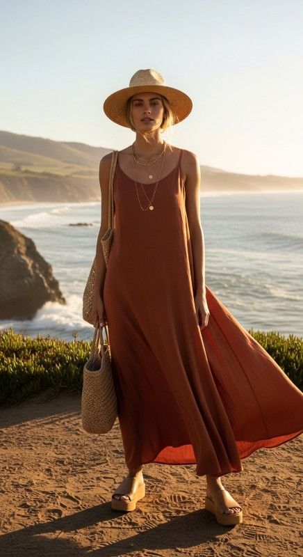 An extra-long linen maxi dress in terracotta provides the perfect length for tall frames while keeping you cool during hot summer days. The relaxed silhouette drapes beautifully on elongated figures without looking overwhelming or shapeless. Pair with platform sandals to maintain proportions and add a wide-brimmed hat for sun protection. A woven tote bag and layered necklaces complete this effortlessly chic bohemian look. The breathable fabric ensures all-day comfort whether you’re at the beach or brunch. This dress celebrates your height while providing the coverage and style you deserve.