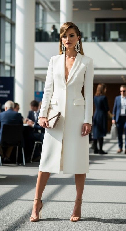 An extended length blazer dress in white creates a powerful silhouette that tall women can command with confidence. The extra length provides appropriate coverage while the structured shoulders add authority. Pair with heeled sandals and a clutch for professional or social events. Add statement earrings and wear hair polished for maximum impact. This modern piece works for presentations, meetings, or cocktail parties. The crisp white color is perfect for summer sophistication.
