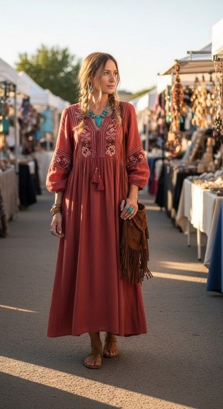 A long peasant dress in terracotta with embroidered details offers bohemian comfort with proper length for tall frames. The flowing silhouette and adjustable neckline provide all-day ease. Pair with flat sandals and a fringe bag for festival or market styling. Layer turquoise jewelry and wear hair in loose braids for authentic boho vibes. This romantic piece celebrates artisanal craftsmanship and relaxed living. The earthy tone complements natural summer settings beautifully.
