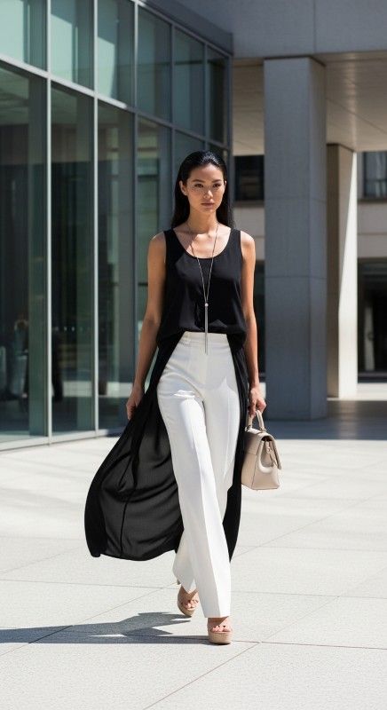 An extra-long tank in black paired with wide-leg pants in cream creates a balanced monochromatic look for tall women. The extended tank length ensures proper coverage while the wide pants provide comfort. Add platform sandals to maintain proportions and prevent pants from dragging. Layer a long necklace and carry a structured bag for polished casual style. This minimalist combination works for various casual or semi-formal occasions. The black and cream palette is timeless and sophisticated.