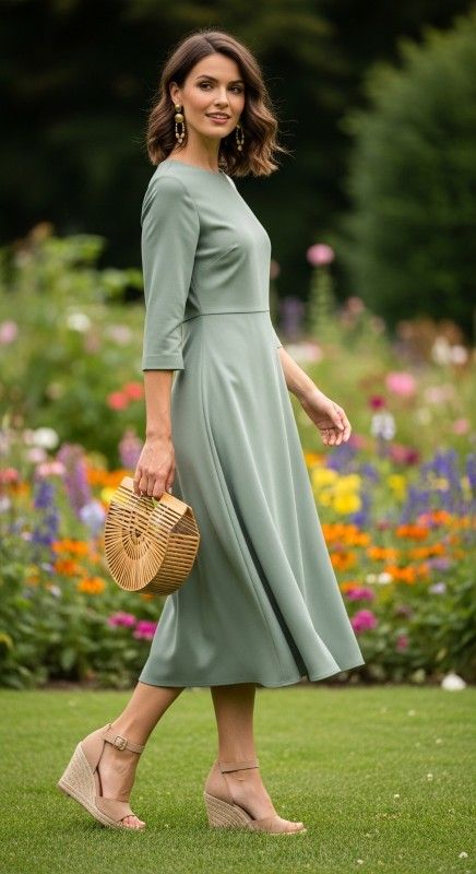 A tall-friendly midi dress in sage green with three-quarter sleeves offers versatile coverage for extended frames. The extra length and adjustable waist tie ensure proper fit throughout the day. Pair with wedge sandals and a woven bag for garden party elegance. Add drop earrings and wear hair in soft waves for feminine styling. This dress works for weddings, showers, or afternoon tea events. The soft green complements various skin tones and summer settings.