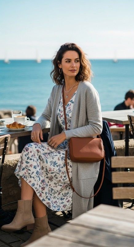 A longline cardigan in gray layered over a floral dress provides versatile layering for tall women during variable summer weather. The extended length creates beautiful vertical lines while adding warmth when needed. Pair with ankle boots or sandals depending on temperature and occasion. Add a crossbody bag and simple jewelry for effortless styling. This combination works for travel days, office settings, or casual outings. The neutral cardigan complements various dress patterns and colors.