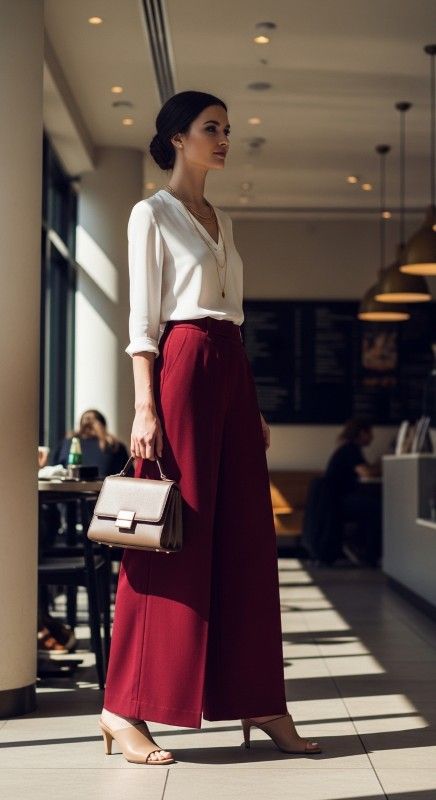 Extra-long culottes in burgundy paired with a tucked-in blouse create a sophisticated silhouette for tall women. The extended inseam and wide leg provide comfort while maintaining elegance. Add heeled mules and a structured bag for polished daytime wear. Layer delicate necklaces and wear hair sleek for contemporary refinement. This modern piece works for creative offices or lunch meetings. The rich burgundy color adds depth to summer wardrobes.