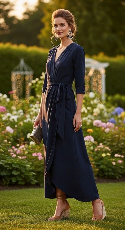 A tall-friendly wrap dress in navy with extended length offers adjustable comfort and flattering draping for tall frames. The extra length and wrap design ensure proper fit without constant adjustments. Pair with wedge sandals and a clutch for versatile summer styling. Add statement earrings and wear hair in an updo to showcase the neckline. This dress works for various occasions from casual to semi-formal. The classic navy color is endlessly versatile and flattering.