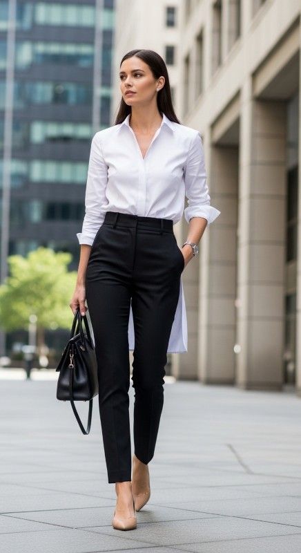 An extended length shirt in white paired with tailored pants in black creates a classic monochromatic look for tall women. The extra shirt length ensures proper proportions when tucked or worn loose. Add pointed-toe flats and a structured bag for polished everyday style. Layer minimal jewelry and wear hair sleek for contemporary elegance. This combination works for professional settings or sophisticated casual occasions. The black and white palette is timeless and appropriate for any setting.