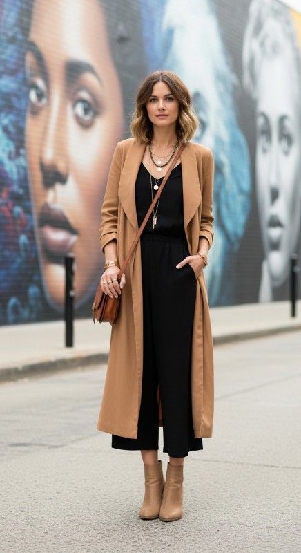A long duster in camel layered over a black jumpsuit adds dimension and coverage for tall women. The extended duster length creates beautiful vertical lines while adding versatility. Pair with ankle boots or sandals depending on the occasion and temperature. Add a crossbody bag and layered necklaces for complete styling. This combination works for travel, casual outings, or creative work environments. The neutral duster complements the black jumpsuit perfectly.