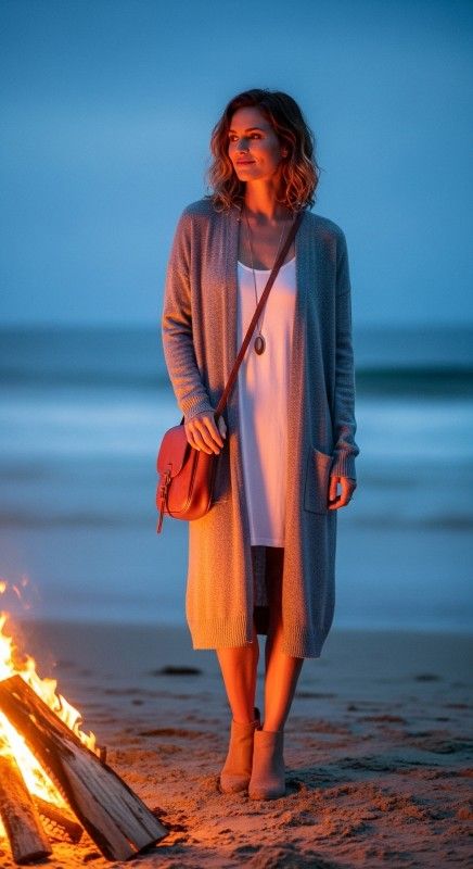 An extra-long cardigan duster in soft gray layered over a tank dress provides versatile coverage for tall women during summer evenings. The extended length creates beautiful vertical lines that complement your frame without overwhelming it. Pair with ankle boots or sandals depending on the occasion and temperature. Add a crossbody bag and simple pendant necklace for effortless styling. This layering piece works over dresses, jumpsuits, or pants for multiple outfit options. The lightweight knit ensures warmth without bulk during cooler summer nights.