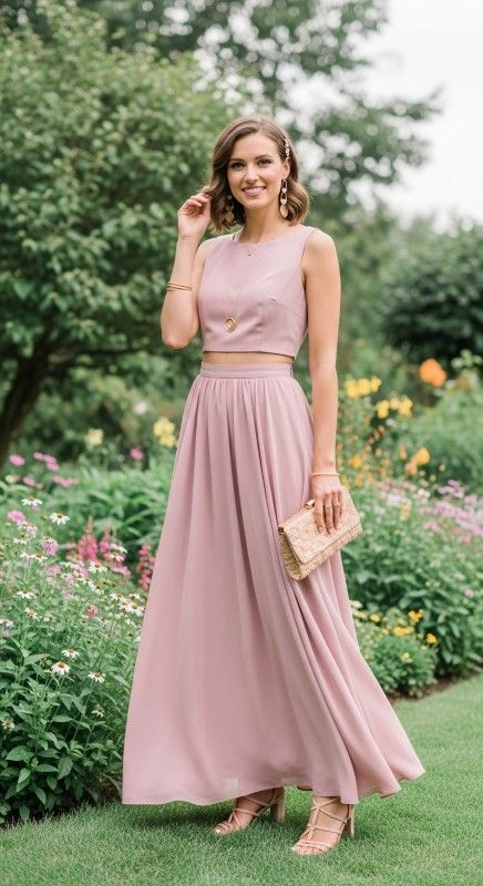 A flowing maxi skirt in dusty rose paired with a coordinating crop top creates a romantic two-piece set ideal for tall women. The extended skirt length provides full coverage while the crop top balances proportions perfectly. Add strappy sandals and a woven clutch for summer wedding guest attire. Layer delicate jewelry and wear hair in soft waves for feminine elegance. This coordinated look simplifies dressing while ensuring proper fit for your frame. The soft color palette is flattering and appropriate for various celebrations.